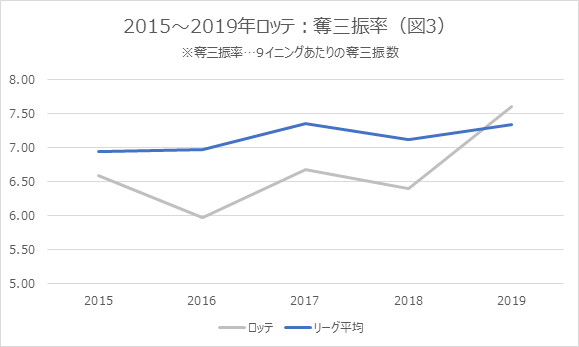 長打を未然に防ぐ方法は、大きく分けて2つある。まずは、打球を前に飛ばされないことだ。つまり、奪三振を増やすのである。ロッテはもともと、奪三振の多いチームではなかったが、今季は奪三振率を昨季の6.40から7.60に上昇させており、打者を確実に打ち取るケースが増えている。