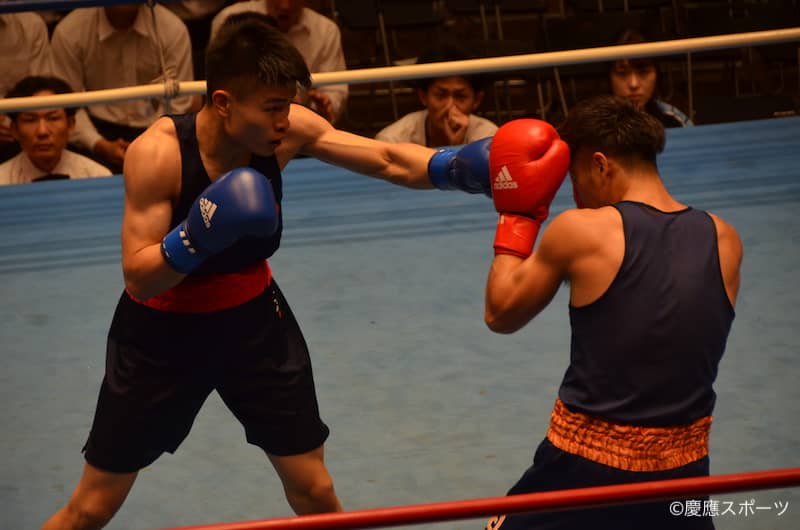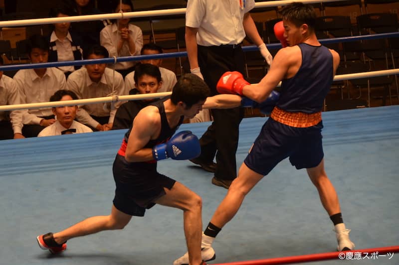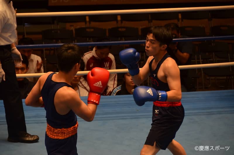 第一試合。ライトフライ級を戦うのは成澤諒だ。体格では相手に軍配が上がったが、1、2Rは低い姿勢でのボディや細かな攻撃を与え続ける。これが着実に相手ダメージとなったことで、3Rは相手に攻撃の隙を与えずひたすらパンチを繰り出すと慶大先制となるポイント勝ちを収めた。