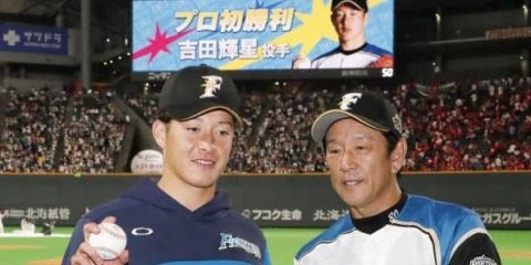 吉田輝、デビュー戦勝利 プロ野球交流戦の広島戦で初先発勝利を挙げ、ウイニングボールを手に栗山監督(右)と記念写真に納ま…