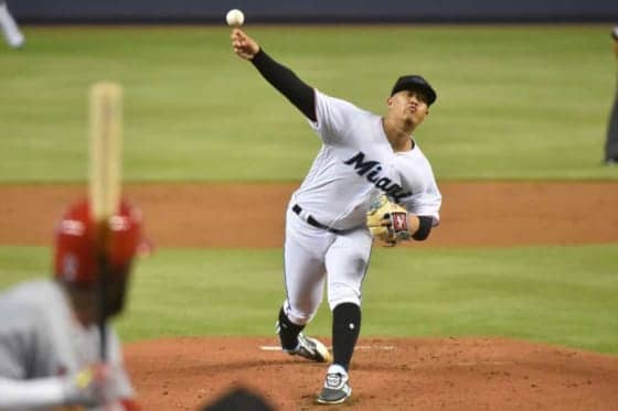マーリンズの日系3世右腕、ジョーダン・ヤマモト投手は12日(日本時間13日)、メジャーデビュー戦となった本拠地カージナルス戦を7回3安打無失点、5奪三振の快投で1勝目を手にした。ヤマモトが投じた“驚愕の1球”をマーリンズ公式ツイッターが伝えている。