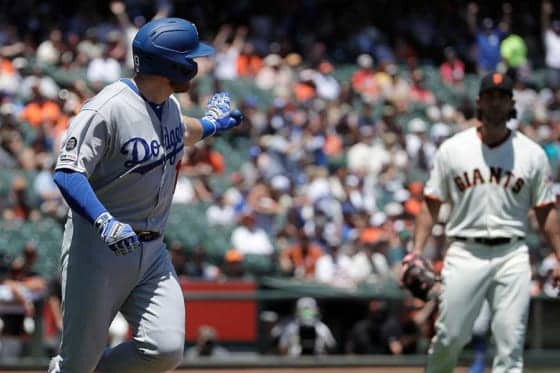 本塁打を放ったドジャース・マンシー(左)と口論したジャイアンツ・バムガーナー【写真:AP】