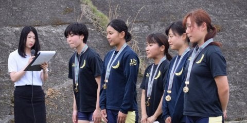 <写真・閉会式でメダルを受け取る女子クォドルプルの選手たち> 6月16日、大阪府神崎川関西河川スポーツ共同艇庫にて…