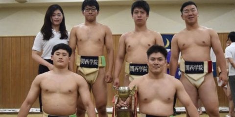 <写真・試合後、トロフィーを持ち写真撮影に応じる選手たち> 6月16日、関西学院大学相撲場にて第42回総合関関戦が行わ…
