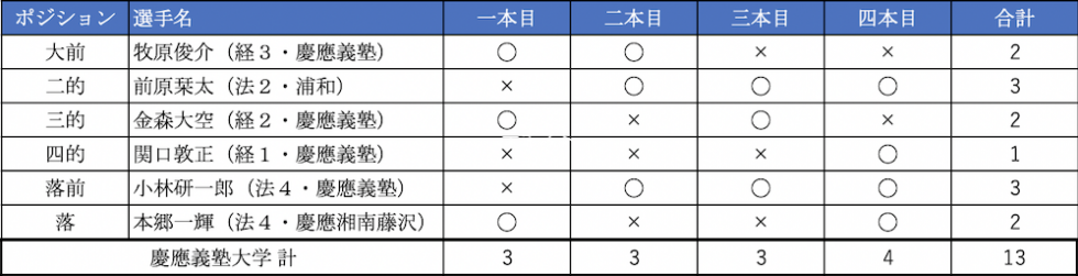 昨年惜しくも決勝トーナメント二回戦で姿を消した男子部は、3選手が下級生というフレッシュなメンバーで臨んだ。しかし、前半12射を終えた時点でわずか6中。普段の慶大からは考えられない的中で予選を折り返す。ここから修正し決勝に駒を進めたい慶大だったが、前半二中していた牧原が2本ともに外すなど的中を伸ばすことができず。24射13中という結果で、慶大男子部の戦いはあっという間に幕を閉じた。