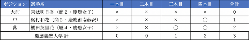 まさかの敗退を喫した男子戦の後に行われた女子戦。慶大は下級生の頃から試合に出続けている3選手で臨む。しかし、男子部の悪い流れを断ち切ることはできない。前半6射を終えて、0中。アリーナに潜む魔物が容赦なく慶大に襲いかかる。後半戦は落を務めた橘田英里香 (経4・慶應女子)が2射2中と粘りを見せるも他が結果を残せず。12射3中という結果で予選敗退となった。