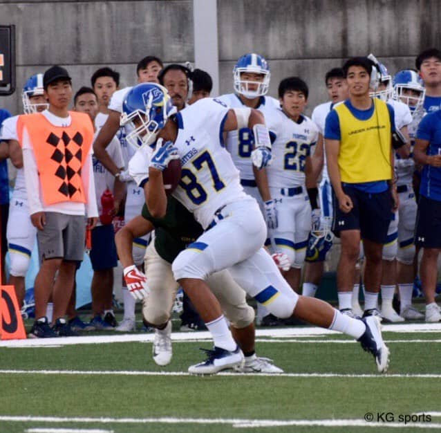 先制したのは関学。第1クオーター(Q)残り6分44秒、RB安西(社2)がランでタッチダウン(TD)。残り2分45秒にも、QB山中(商2)からWR山下(人4)への15ヤードのパスが決まり、TDを決めた。だが、第1Q終了間際、ゴール付近で相手オフェンスを何度も止めるも、最後はTDを許した。第2Qに入ると、残り5分8秒にセーフティで2点を追加。その後、WR鳩谷(文2)が73ヤードのリターンTDを決めた。さらに、第2Q残り9秒にRB齋藤がTDを決め、追加点。30ー7で前半を折り返す。後半はパスが光った。QB平尾(社2)からWR大村(人3)、WR河原林(教1)へ連続でパスが成功し、名大を突き放す。しかし、第3Q、残り3分37秒には、再び7点を返される。44ー14で迎えた第4Q、試合時間残り50秒にWR高野(社1)へのロングパスが決まり、ダメ押しのTD。攻めの攻撃で得点を重ね、名大に勝利した。
