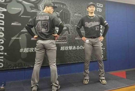 「Aggressive BLACK」カラーユニホームを着用した増井浩俊(右)と山本由伸【写真:橋本健吾】