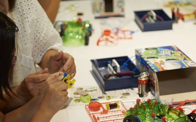ヤマハ発動機主催による「モーター工作教室」(定員25名/回)では、モーターの仕組みや性能を学び、実験で確認したあと、モーターカーを工作し、完成したモーターカーでレースを楽しむ。