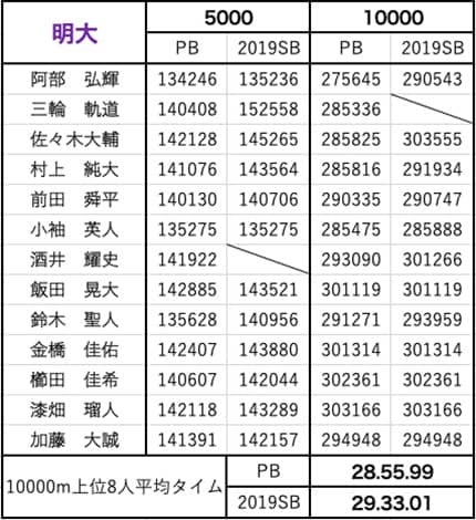 表2:明大の各選手記録と1万メートル上位8人の平均タイム