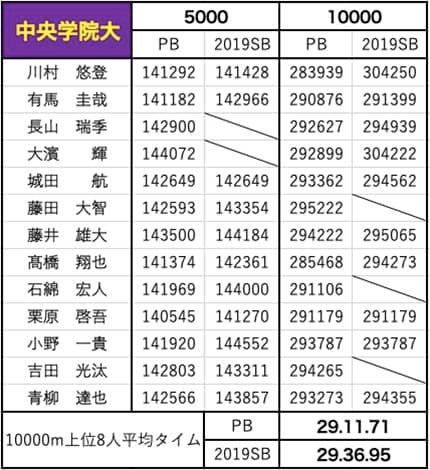 表3:中央学大の各選手記録と1万メートル上位8人の平均タイム