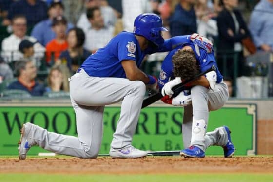 ファウルがファンに直撃し、涙するカブスのアルモラJr.(右)【写真:Getty Images】