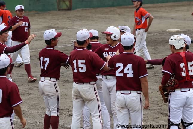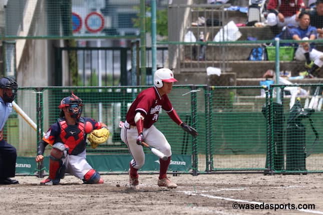 まず初戦、早大は花王コスメ小田原との一戦に臨んだ。トーナメント表を見た時、「強いチームが逆の山にいって、こちらの山で強いのが花王コスメ小田原」(丹野太郎主将、スポ4=兵庫・滝川)。初戦、全力で勝利を挙げることが、全国進出には一番の近道であると感じたのだ。先制攻撃を目指した早大は、春季リーグ戦でクリーンアップを打っていた選手を上位打線に並べるなど打線を入れ替えた。しかし初回は三者凡退、狙いは外れてしまった。だが2回に先頭の澤優輝(人2=東京・国学院久我山)が四球で出塁すると、続く5番・高橋尚希(スポ3=宮城・泉館山)もフルカウントから粘る。9球目を中前へ運ぶと、その間に一塁走者が三進して好機が広がった。