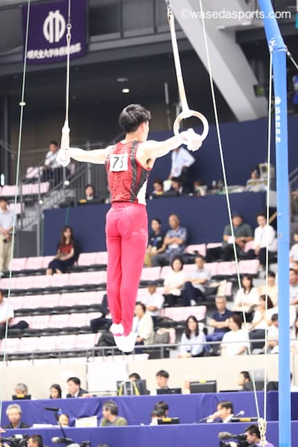 つり輪の演技をする南