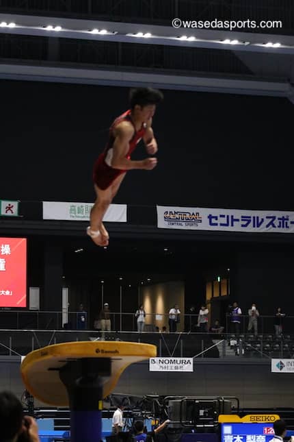 続く後半、早大からは跳馬に柏木寅冶主将(スポ4=千葉・市船橋)、鉄棒に山田元大(スポ3=千葉・市船橋)が登場した。「大過失なく良い跳躍ができた」と語る柏木は、1本目のロペス・2本目のロウユン共に迫力のある大きな跳躍を披露した。2本とも14点台に乗せたが、結果は決勝進出ラインとなる8位に僅かに及ばぬ9位。着地でずれた1歩など、細かいミスが響いた。「少しでも得点を重ねることの大切さというのを改めて感じました」と振り返りながら、今後に向けて意気込んだ。