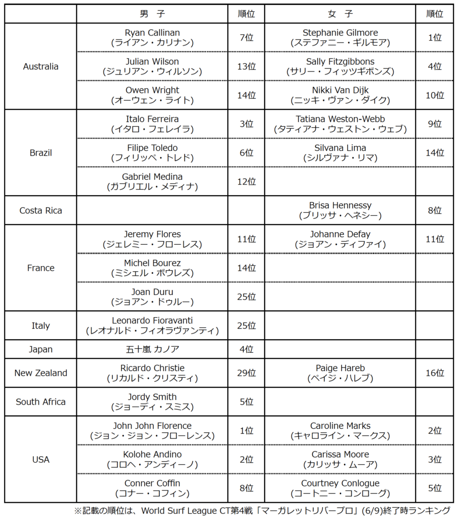 このたび、WSLチャンピオンシップツアー(CT)第4戦終了後のランキングによってクレジットされた選手が発表された。男子は2018年ワールドチャンピオンのガブリエル・メディナ(BRA)、2016年と2017年ワールドチャンピオンを獲得したジョン・ジョン・フローレンス(USA)がエントリーしています。また、女子は2018年ワールドチャンピオンで7度目のタイトルを獲得しているステファニー・ギルモア(AUS)、昨年の2018年愛知県で開催されたワールドサーフィンゲームスで優勝したサリー・フィッツギボンズ(AUS)ら世界のトップランカーたちが宮崎に集結します。各国の出場選手は以下の通り。
