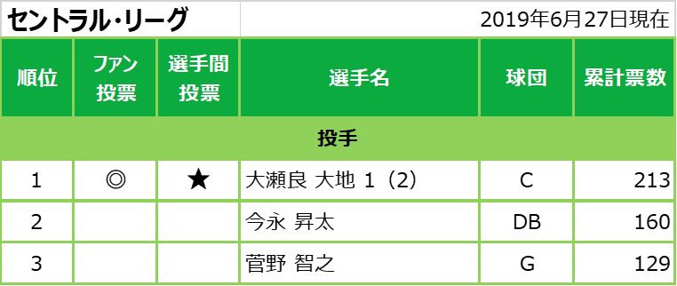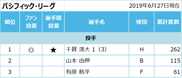 日本野球機構(NPB)は6月27日、マイナビオールスターゲーム2019(第1戦=7月12日・東京ドーム、第2戦=同13日・甲子園)選手間投票結果を発表した。