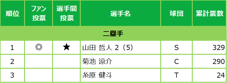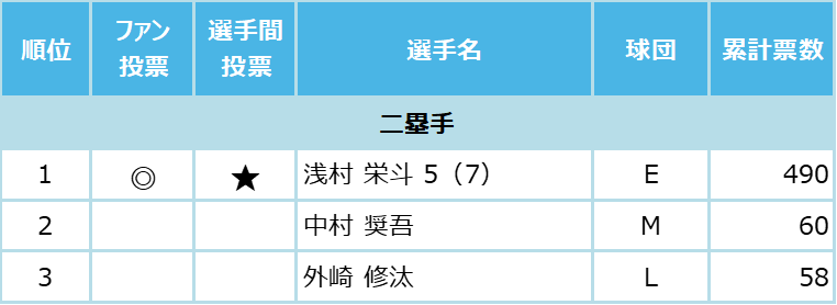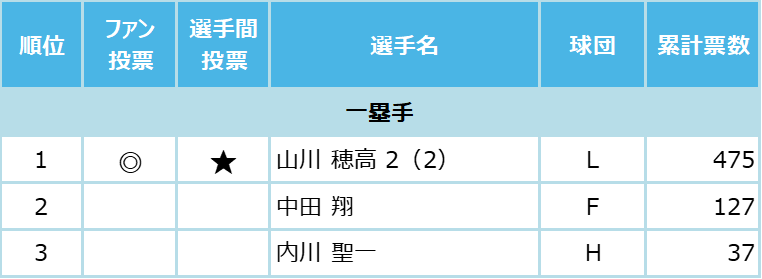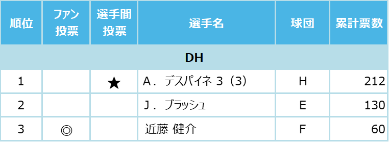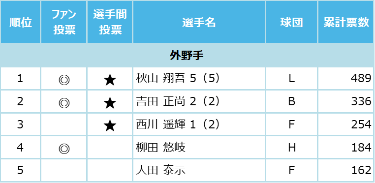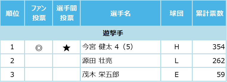 選手間投票とは、12球団の支配下選手742 人が、ポジション別にセ・パの計19部門に投票したもので、獲得票数トップ選手の中から、すでにファン投票選出が決定している13人を除く6人のオールスター出場が今回、新たに決まった。