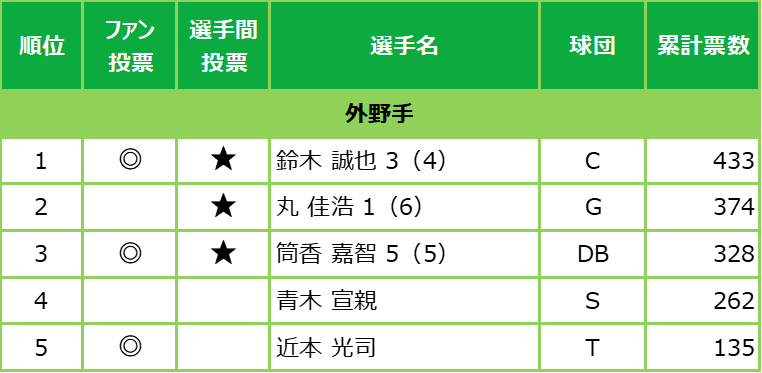 ★印当選、◎印はファン投票での選出選手 / 選手名右の数字は選手間投票選抜回数、( )内の数字は全選抜回数