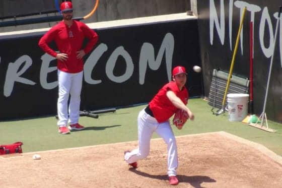 ブルペンでの投球を行ったエンゼルス・大谷翔平【写真:盆子原浩二】