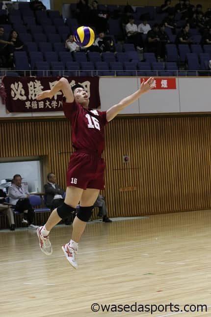 きのうスタメンであった岩本大吾(スポ1=兵庫・市尼崎)に代わり上條レイモンド(スポ2=千葉・習志野)が今季初スタメンとしての出場を果たした。第1セット序盤、3-1から重藤トビアス赳のスパイク、サービスエースを含む3連続得点を稼いだ早大。しかしその後はなかなか点差を広げることができなかったものの一進一退の攻防から一歩前に出ることに成功。11-11の場面から相手のスパイクアウトなどで3連続得点を獲得すると徐々にリードしていく。19-15で武藤鉄也副将(スポ4=東京・東亜学園)がサービスエースを決め20-15。その後サーブミスで相手に16点目を献上するもののここから上條のクイックを含む5連続得点を獲得し第1セットは早大が先取した。迎えた2セット目、大塚達宣(スポ1=京都・洛南)がレセプションアタックを決め先制点をもぎ取る。するとこのまま早大が5連続得点。セット中盤以降もペースをつかみ続け、村本涼平(法4=京都・洛南)のスパイク、武藤副将の2連続のクイックなどで20-13に。最後は重藤トビアス赳(スポ1=神奈川・荏田)がストレートスパイクを決めて第2セットも連取した。