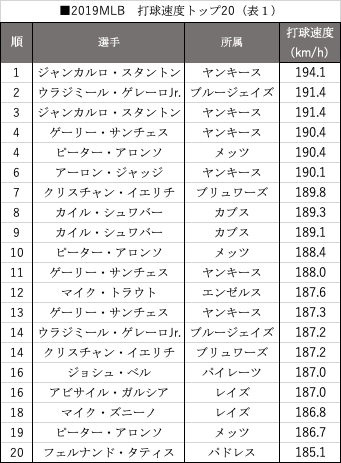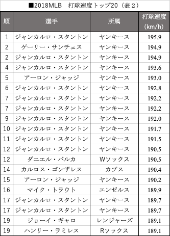 その他、改めて2019年のランキング(表1)を見ると、スタントンと同じヤンキースでは26歳の正捕手、ゲーリー・サンチェスが4位と11位にランクイン。2018年も2位の打球速度を記録したサンチェスは今季、59試合出場の段階でリーグ2位の23本塁打を放っており、打球速度が成績にも如実に表れている。