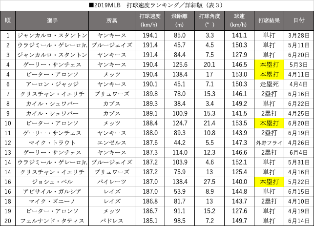 2019年の打球速度ランキングをさらに細かくした詳細版(表3)を見ると、トップ3はいずれも単打。