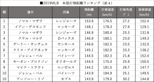 打球の飛距離の面から見てみたい。2019年の本塁打飛距離ランキング(表4)を見ると、トップはノマル・マザラ(レンジャーズ)が6月21日のホワイトソックス戦でレイナルド・ロペスの152.4キロを捉えた一発で、153.9メートルを記録した。