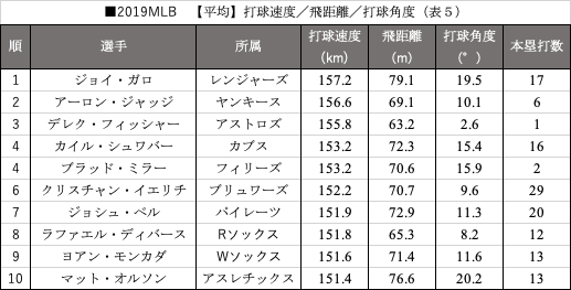 もう一つ、2019年の平均データを見てみたい(表5)。平均の打球速度トップを記録したのは、ジョイ・ガロ(レンジャーズ)。2017年に41本塁打、2018年に40本塁打を放った25歳のスラッガーは、自慢のアッパースイングで平均打球速度157.2キロを計測するとともに、ここまでチームトップの17本塁打を放っている。