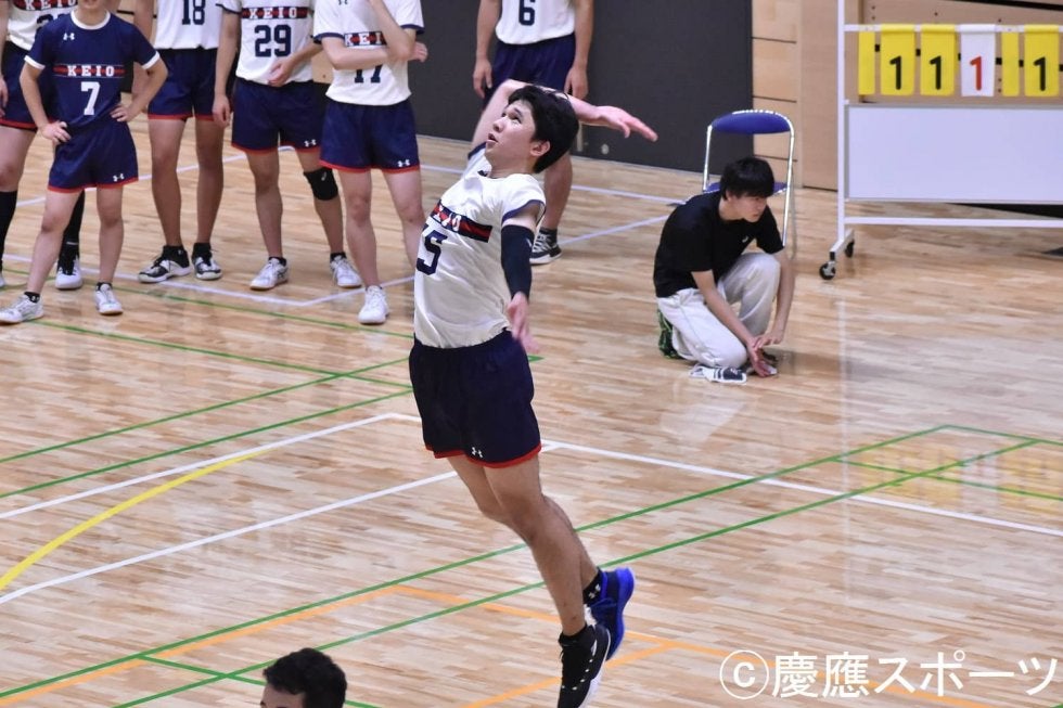 立ち上がりの慶大は、伸び伸びとしていた。WS吉田祝太郎(政3・慶應)のバックアタック、MB降小雨(商1・慶應)のブロックで早々にブレイクを奪う。だが、相手も譲らない。正確なサーブレシーブ、多彩な攻撃で着実に得点を重ねられた。中盤、サーブレシーブの乱れから失点が続き、次第に点差を離されていく。なんとか流れを変えたい慶大は、13-21の場面でピンチサーバー高倉真古都(商1・慶應)を投入。すると、大学公式戦初出場の高倉がコートの隅に落とすノータッチサービスエース。慶大のコート、ベンチ、応援席が大いに盛り上がった。このまま流れに乗りたい慶大だったが、最後まで中大が逃げ切り、18-25で第1セットを落とした。