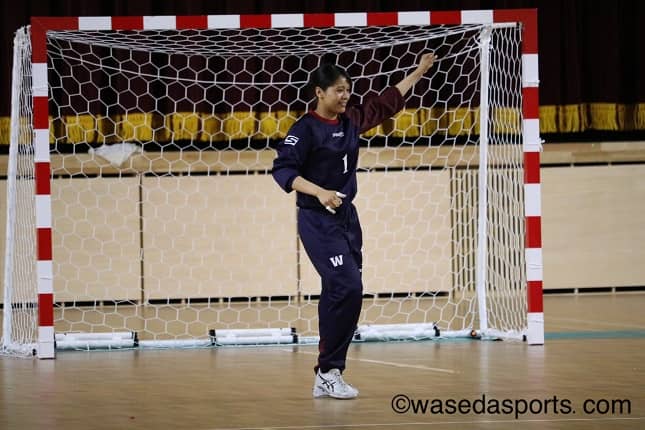 試合開始早々、吉田瑞萌(スポ3=東京・佼成学園女)がカットインからシュートを決めて先制に成功したものの、その後は相手のミドルシュートを主体とした攻撃に苦しめられ攻め込まれる時間が続く。しかし、大沢が前半4分までに4本のシュートを止めるなどファインセーブを連発。集中した守備で相手になかなか得点を許さない。2点ビハインドになった前半10分過ぎには吉田、山根萌(スポ3=千葉・昭和学院)、杉山瑞樹主将(社4=神奈川・横浜創英)の3連続得点で一気に逆転に成功するなど、流れを徐々に引き寄せる。前半終盤には大沢が相手のポストシュートを左足一本で防ぎ、この日一番の歓声が起きた。前半終了間際、タイムアウト後の相手の7人でのセットオフェンスを防ぎきれずに同点に追いつかれてしまったが、その直後に早大もタイムアウトを取り、その後のセットオフェンスから残り2秒で吉田がミドルシュートを突き刺し勝ち越しに成功。1点リードで前半を終えた。