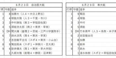 決勝123456789計専大0000300003早大12504020X14(早)清水、○田中爽-吉田龍♢(本塁打)鷲田(…