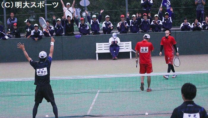 王者・明治の貫禄を見せつけた。小雨が降る中で行われた今大会。コートのコンディションは決して良くはなかったが、初戦から相手を終始圧倒し決勝までストレート勝ち。決勝で待っていたのは、宿敵・早大。1番手の本倉健太郎(農3=岡山理大付)・根本大地(政経2=高田商)ペアが流れを作る。因京将(早大)の鋭い球に臆せず、本倉の速く奥に伸びるストロークで試合をコントロールし、根本が緩んだボールをすかさずボレー。果敢な飛び出しも多く見られた。「本倉さんとプレーがうまくかみ合っていた」(根本)。本倉のストロークと根本の俊敏なポジショニングで、相手を圧倒。ストレート勝ちを収めた。続く2番手は、北本達己(商2=高田商)・丸山海斗(政経4=上宮)ペアが内本隆文(早大)のキレのあるストロークと上松俊貴(早大)の正確なボレーを前に完敗。「内本をよく知っているが、入りから集中しているのはあまりない」(丸山)と早大陣営のかける思いの強さをうかがわせた。1勝1敗と並び、勝負を決める三番勝負では中平慎吾(農4=尽誠学園)・米澤要(営4=能登)ペアが春リーグに引き続き4年生の意地を見せ、粘り勝ち。早大を2ー1で下し、東日本インカレを優勝という形で締めくくった。