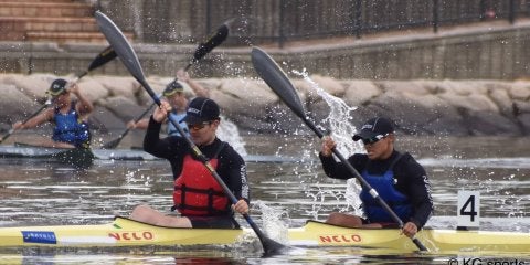 <写真・{K-2}500メートルで優勝した岡村・大山組> 6月30日、芦屋キャナルパークにて、第49回大阪学生選手権大会…