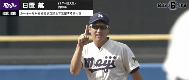 大器の予感を彷彿とさせる1年生・日置の神宮デビューを選出。優勝決定の試合での初打席初安打初打点そして落ち着いた守備!プレッシャーの中で堂々たる姿にカメラマンも驚かされた!