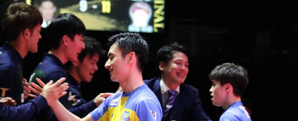 写真:手前左から上田仁・森薗政崇(ユニフォーム姿)、ベンチ左から吉村和弘・イサンス・吉田雅己・白神宏佑監督(ともに岡山リベッツ)/撮影:ラリーズ編集部