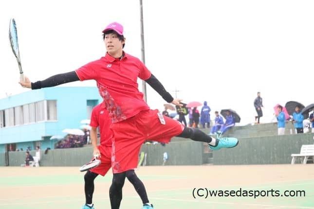 トーナメントを順調に勝ち上がり迎えた準々決勝の東洋大戦。一番に登場したのは長尾景陽(社4=岡山理大付)・松本倫旺(スポ4=熊本・済々黌)ペア。オーダー変更により一番での登場で身体が硬くなっていたのか、1ゲーム目から攻めきれず、ゲームをとられてしまう。しかしそこから、落ち着いて自分たちのゲームにもっていき無事白星をあげた。二番は大将ペアである内本隆文(スポ4=大阪・上宮)・上松俊貴(スポ3=岡山理大付)が試合に挑んだ。最初の2ゲームをとられてしまい、不安な展開となるが3ゲーム目で内本が流れを変える。相手の浅いロブをバックボレーで決めるなど一気に4ポイント連続でとり、ゲームカウント1-2になる。5ゲーム目まで順調にゲームをとり、次の6ゲーム目で試合を終わらせたい場面。「チャンスボールが来たのを決められなかった」と内本が振り返るように弱気なプレーになってしまいファイナルへともつれこむ。しかし、流れを断ち切るかのように、上松がボレーをすぐ決め、なんとか持ち直す。ジュースは続いたものの最後は実力を発揮し勝利を決め、無事早大が次へと駒を進めた。