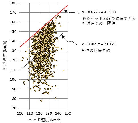 城所氏が収集したデータ「打球速度とヘッドスピードの関係」(図1)を見る。ここで注目したいのは、右上がりの赤線より上にデータがないことである。例えば打球速度160km/hを出そうとすれば、ヘッドスピード130km/hが最低でも必要ということがわかる。