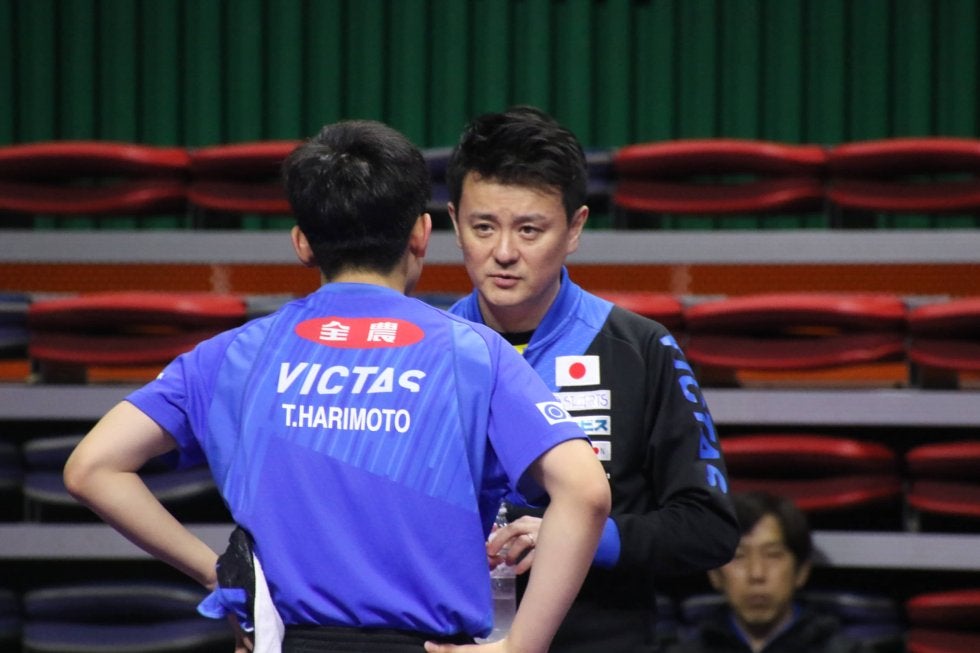 写真:張本にアドバイスをする倉嶋監督/撮影:ラリーズ編集部