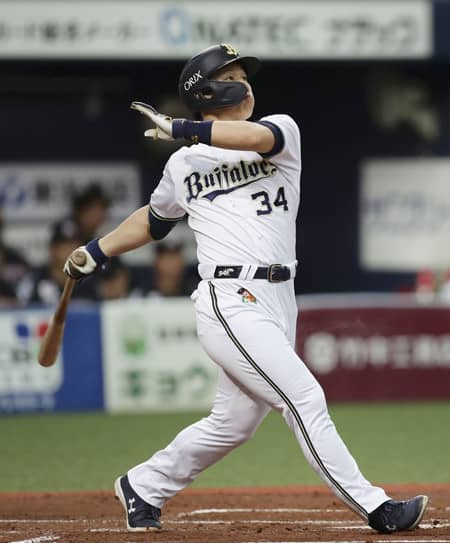 いち早くフェイスガードを着用したオリックスの吉田 photo by Kyodo News