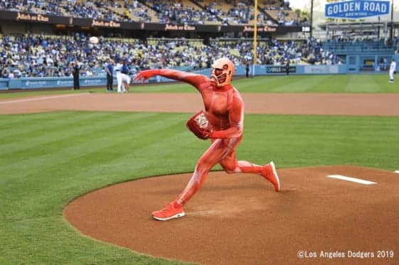 アニメ「進撃の巨人」の公式マスコット「巨人くん」がドジャース-パドレス戦の始球式に登場パドレス 3-2 ドジャース(日本…