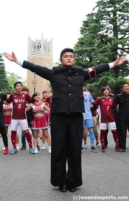 壮行会を締めくくるのも『紺碧の空』である。センターリーダーを務めたのは雲見恭光・学生誘導対策責任者(スポ4=茨城江戸川学園取手)だ。早慶サッカーを応援するために応援部に入ったという雲見は並々ならぬ決意で早慶サッカーに臨んでいる。昨年は1点先制された状況でも選手を信じて応援し、早稲田は見事7連覇を達成した。親友であり、その2点を返したア式のエース・FW武田太一(スポ4=ガンバ大阪ユース)が今年は怪我で試合に出場できないという。「俺はあいつの分まで戦いたい」早慶のプライドをかけて応援する雲見の背中は、連覇の立役者である、親友武田の思いをも背負っているのであった。