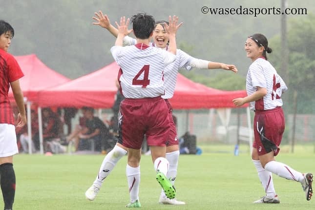 雨足が強まる中始まった後半。54分に廣澤と並木のワンツーから廣澤がミドルシュートを放つ。その1分後には「攻撃の時にもっと裏へ抜ける人を増やして、攻撃に厚みを持たせよう」(MF高瀬はな主将、スポ4=ジェフユナイテッド市原・千葉レディースU18)とハーフタイムに確認したように、DF中田有紀(スポ4=兵庫・日ノ本学園)がオーバーラップで抜け出し、MF田中実夏(スポ4=セレッソ大阪堺レディース)にパスを通すが、相手ディフェンスにブロックされる。すると59分、後半から背後のスペースを狙ってきた相手に対応することができず、1本の縦パスでMF井戸ケイトに裏を取られ、ゴール前に走り込んだFW島田芽依に痛恨の同点弾を許した。69分の中條のFKはクロスバーに嫌われ、70分には田中の折り返しに並木が反応したものの、GK福田史織の飛び出しに防がれる。勝ち越し点を奪えないでいると、79分に絶体絶命の危機を迎える。GK川端涼朱(スポ3=東京・十文字)がボールを奪われてシュートを打たれてしまう。だが、ここはDF船木和夏(スポ1=日テレ・メニーナ)がゴールライン手前でなんとかクリアした。81分には、MF蔵田あかり(スポ2=東京・十文字)がパスカットし、廣澤のリターンを受けシュートを放つも、うまくミートすることができない。89分には田中のスルーパスから廣澤が福田と1対1になるが、福田の好判断で逆転ゴールとはならず。1-1で勝ち点1を分け合った。