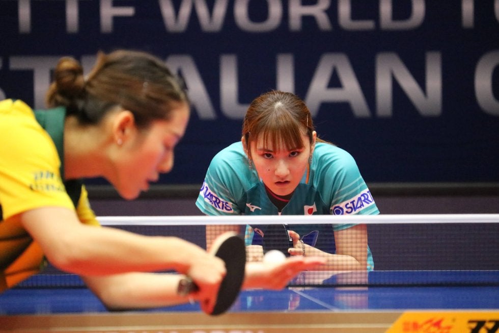 一方で、相馬夢乃はハン・イン(同36位・ドイツ)とのカットマン(台から距離を取り、バックスピンをかける打法での返球を軸に守備的に戦うスタイル)対決に挑んだ。1ゲーム目を先取し、幸先良いスタートダッシュを切ったが、その後は相手の攻撃やカットの質の差になすすべなく4ゲームを連取された。