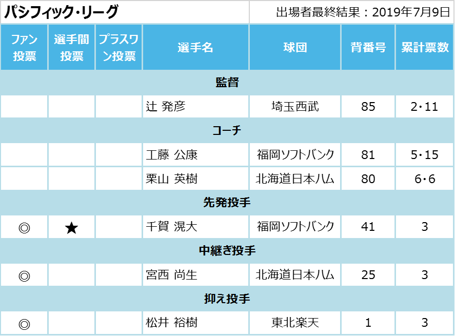 加えて、ファン投票で選ばれていた柳田悠岐と今宮健太(ともに福岡ソフトバンク)の2人が故障のために出場を辞退。代わりにグラシアル(福岡ソフトバンク)と増田達至(埼玉西武)の2人が補充選手としてオールスターに出場することも発表された。