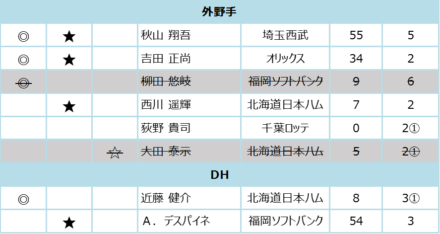 ◎印はファン投票選抜、★は選手間投票選抜、☆はプラスワン投票選抜、他は監督選抜による。