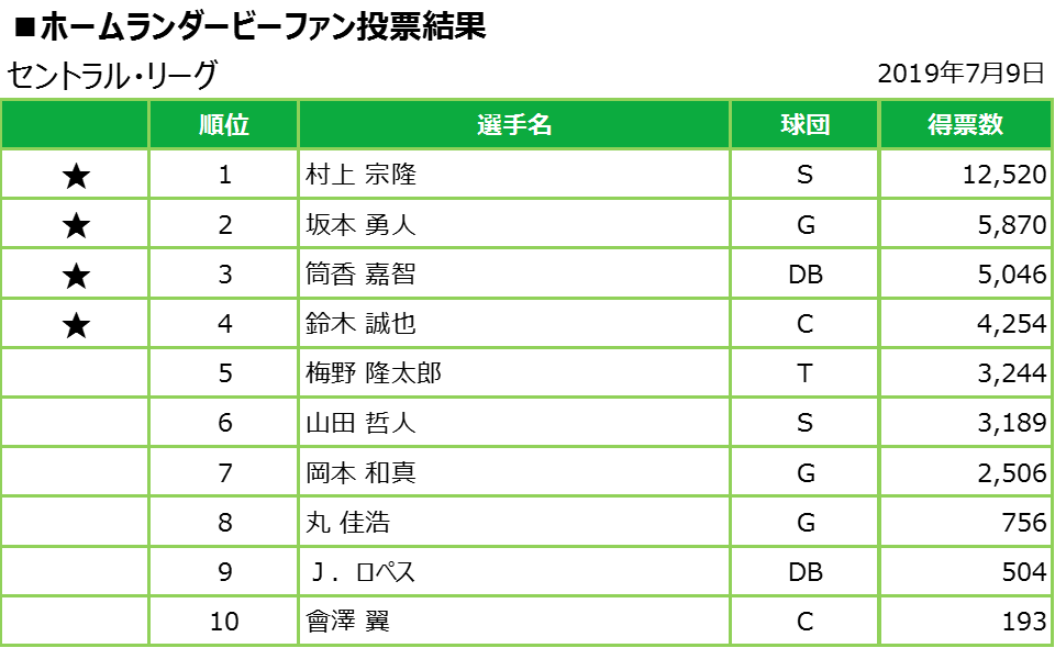 日本野球機構(NPB)は7月9日、マイナビオールスターゲーム2019(第1戦=7月12日・東京ドーム、第2戦=同13日・甲子園)のプラスワン投票の発表を行った。