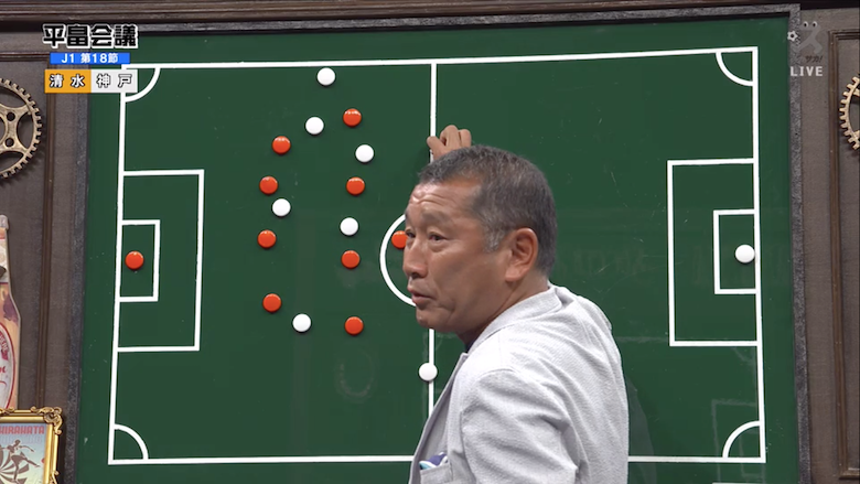 また、都並はボードを使って得点シーンを解説。右サイドバックのエウシーニョ(清水)が、郷家友太(神戸)の飛び出しを警戒するあまり、清水のディフェンスラインにズレが生じていたという。