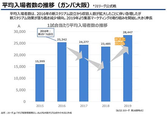 「2014年にチームが三冠(リーグ、リーグカップ、天皇杯)を獲得したこともあり、万博でのラストシーズンとなった2015年は比較的、集客をしやすいシーズンでした。その流れもあり、また新スタジアムへの興味もあって2016年は、前年度から1万人近く平均入場者数が伸びたのだと思います。ですが、2017年、2018年はその数字が年々、下降線をたどり、明らかに”新スタジアム効果”の薄れを感じていました。