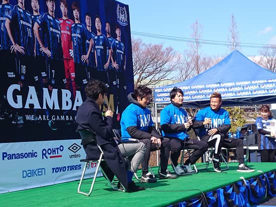 今季開幕戦では、選手OBを招いてトークショーを行なった。舞台上の右から播戸竜二氏、武井択也氏、加地亮氏。©GAMBA OSAKA