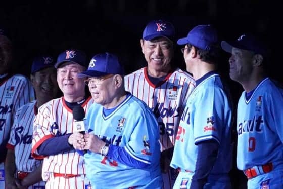 ヤクルトの球団設立50周年を記念したOB戦「オープンハウス presents スワローズ ドリーム ゲーム」が11日、神宮球場で開催された。試合後のセレモニーでは「GOLDEN 90’s」を率いた野村克也監督がマイクを持ち、ファンの心に染みるスピーチを行った。